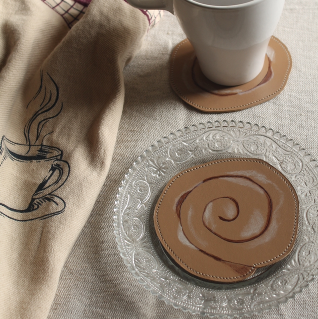 Ces dessous de verre imitent des "Cinnamon Rolls" en cuir de veau italien couleur cappuccino et peints à la main avec de la peinture pour cuir.
