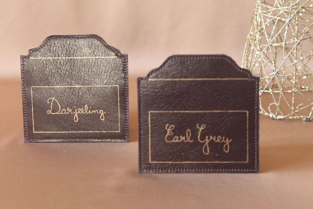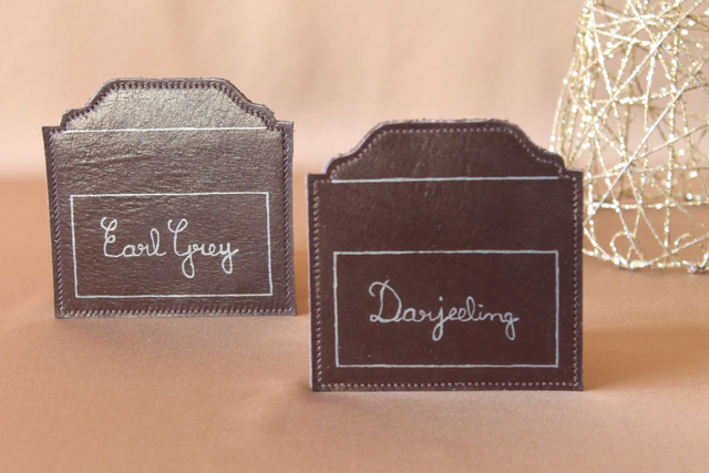 Pour vous accompagner à l’heure du thé, les pauses café et vos soirées d’automne : ensemble de 4 dessous de verre Boite à thé cuir veau marron chocolat lisse dont 2 dessins darjeeling avec liseré argenté et 2 dessins earl grey avec liseré cuivre côté face et au dos le logo peint à la main ( peinture pour cuir). Emballé avec un petit nœud argenté irisé.